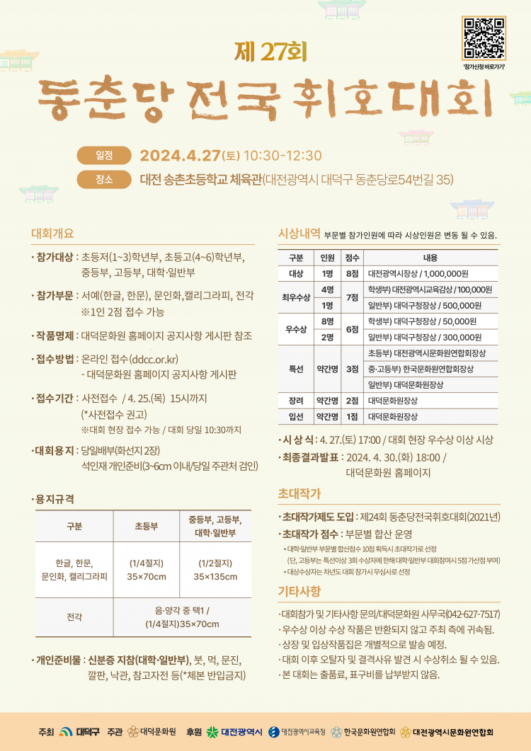 ** 대상은 상금이 백만 원이 수여가 되니 휘호대회 참가해 보세요.